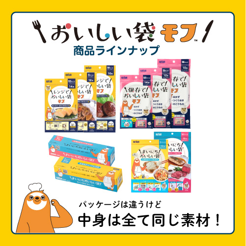 Q:それぞれの商品に違いはありますか? A:「まいにちおいしい袋」「レンジでおいしい袋モフ」「保存でおいしい袋モフ」は、すべて同じ素材です。 用途がわかりやすいようにパッケージデザインや商品名を変えています。