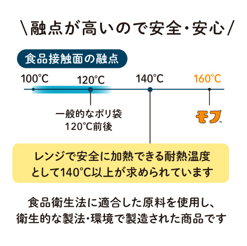 レンジで安全に加熱できる耐熱温度(140℃)を満たしており、一般的なポリ袋(100~120℃)に比べて高い耐熱性を持つため、電子レンジ加熱にも安全にご利用いただけます。さらに、袋の融点は 160℃。