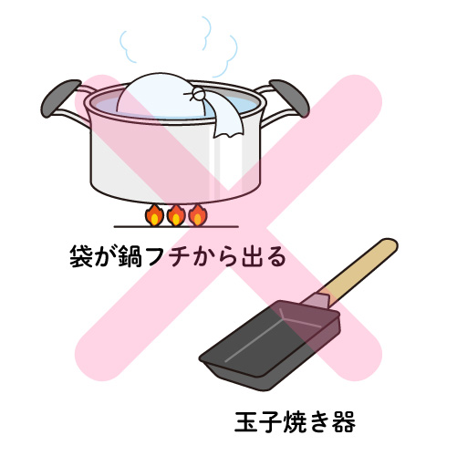 湯煎の際は深型の鍋を使用し、袋が鍋のフチから出ないようしてください。 -