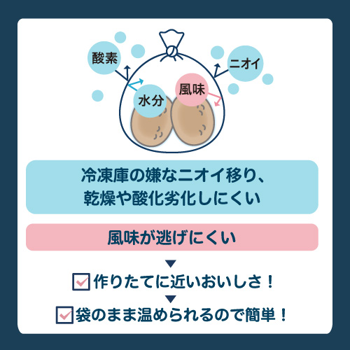モフで冷凍保存すると、ニオイうつりや乾燥を防ぐので、あたためた時に、作りたてに近いおいしさでいただけます。