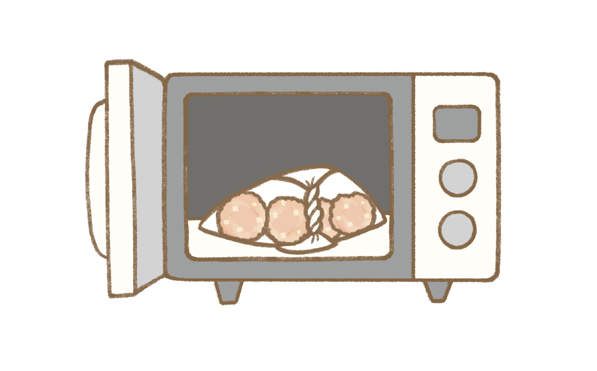 袋の口をねじって下に入れ、レンジで1分加熱する。