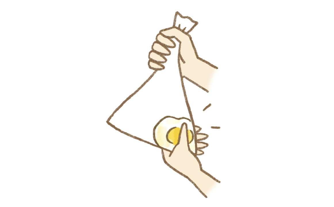 おいしい袋モフに卵を割り⼊れ、袋ごとよく揉みほぐす。