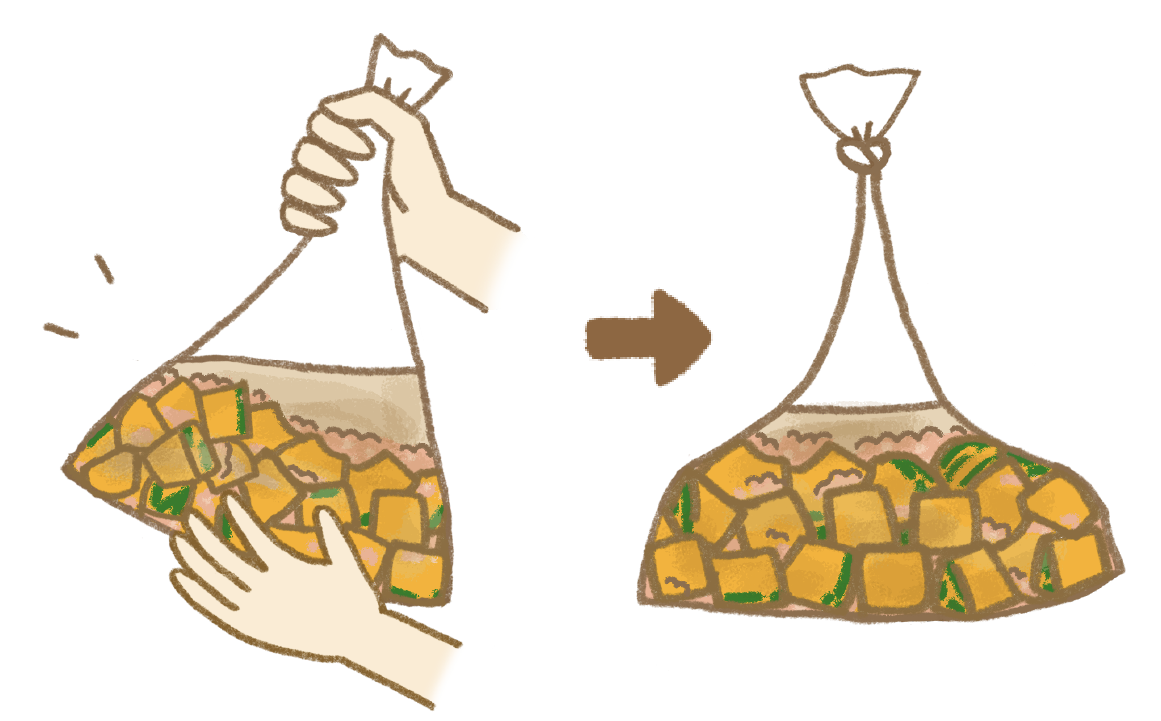 ②に①を加えて混ぜ合わせ、袋の空気を抜いて口を上の方で結ぶ。