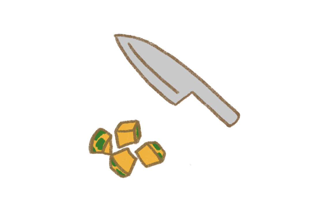 かぼちゃは⽪をところどころ削り、⼩さめの一口サイズに切る。