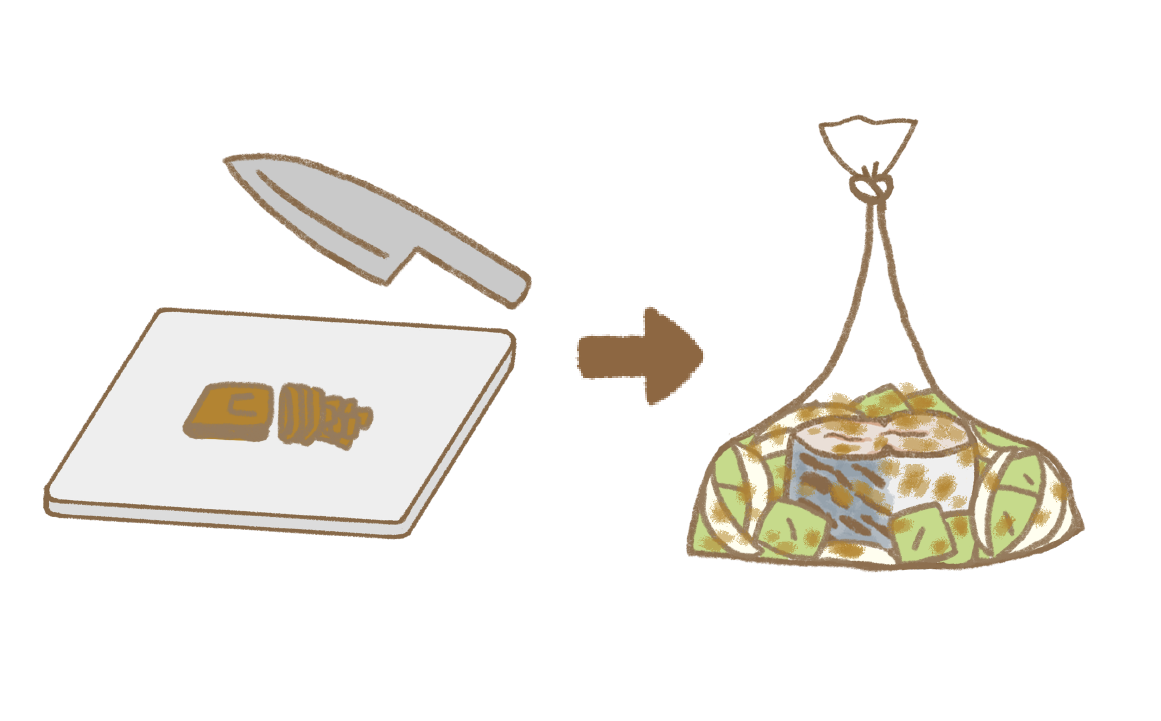 カレールーを細かく刻んで②に加え混ぜ、袋の空気を抜いて口を上の方で結ぶ。