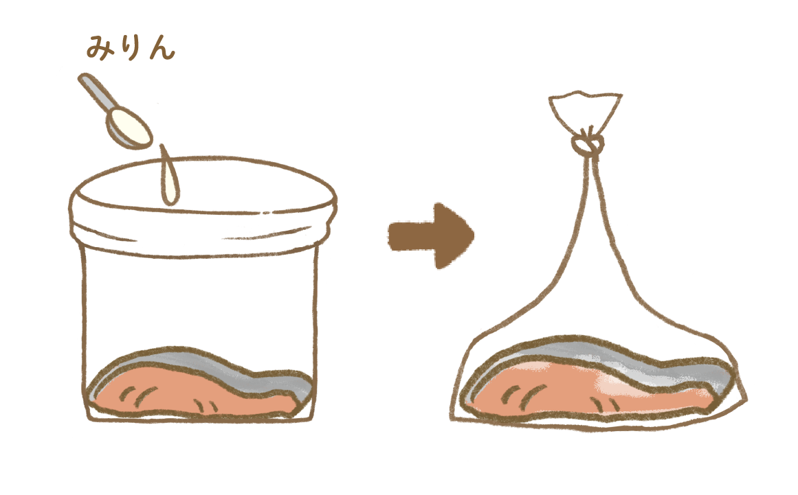 おいしい袋モフに塩鮭を⼊れ、みりんを全体にふりかける。