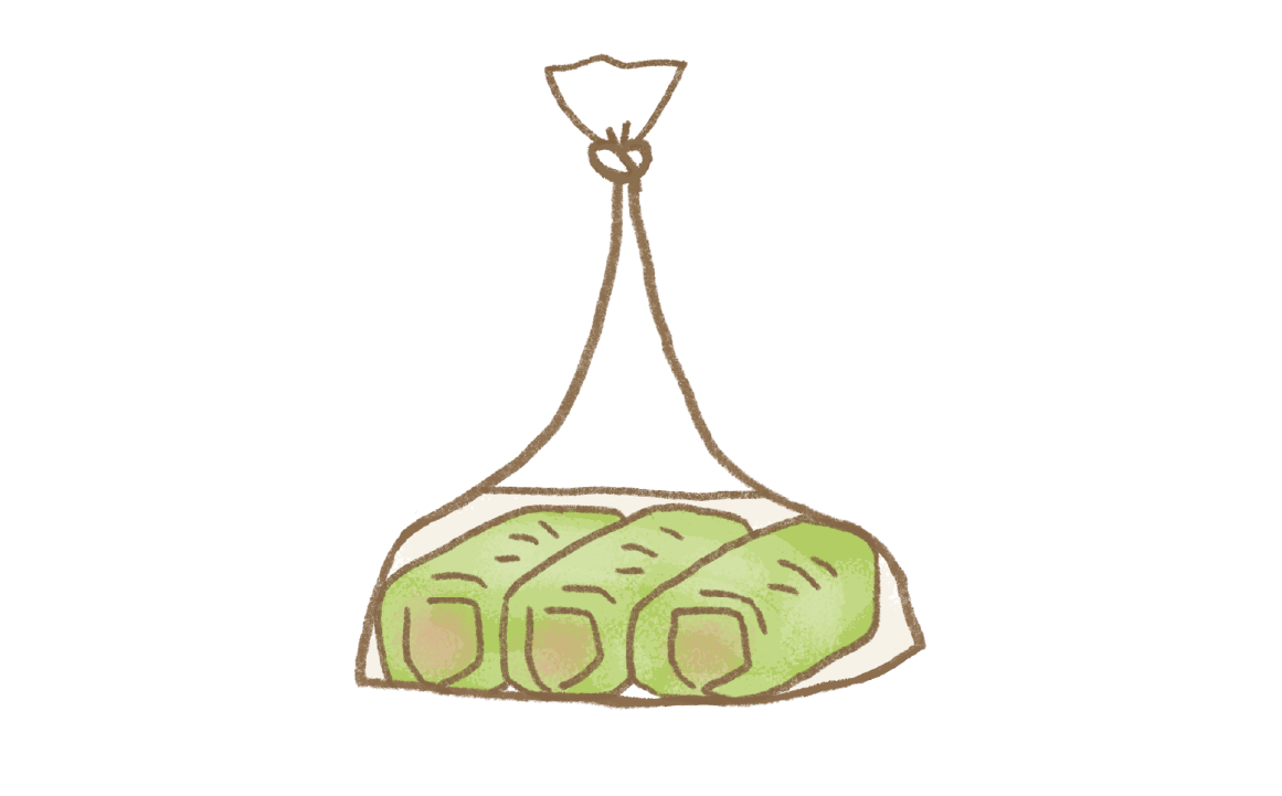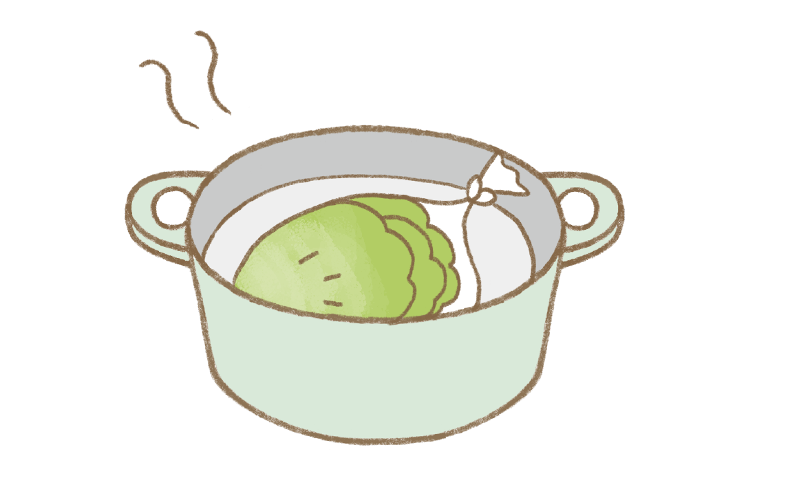 ②を3等分にして丸め、①のキャベツで包み、②の袋に戻す。