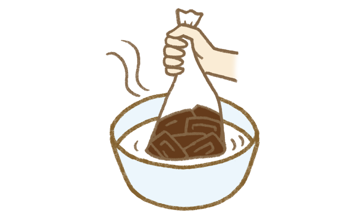 ・湯煎の際は深型の鍋を使用し、袋が鍋のフチから出ないようしてください。