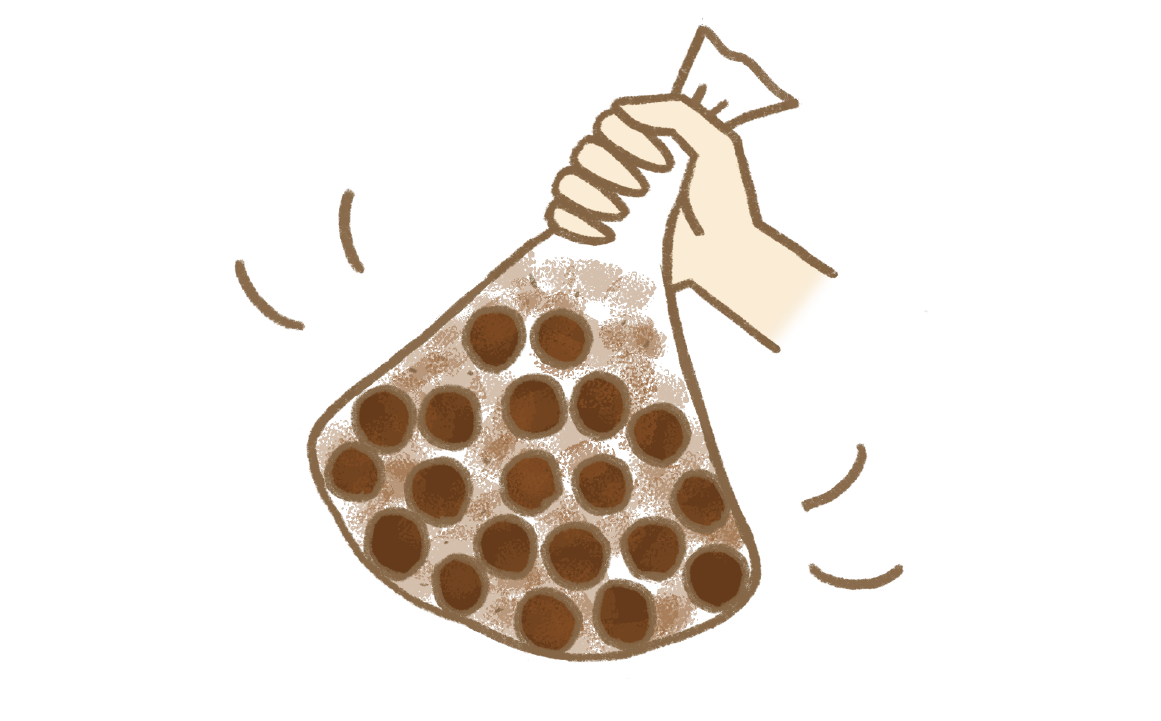 新しいおいしい袋モフにココアパウダーを入れ、③を入れ、全体にパウダーをまぶして完成。