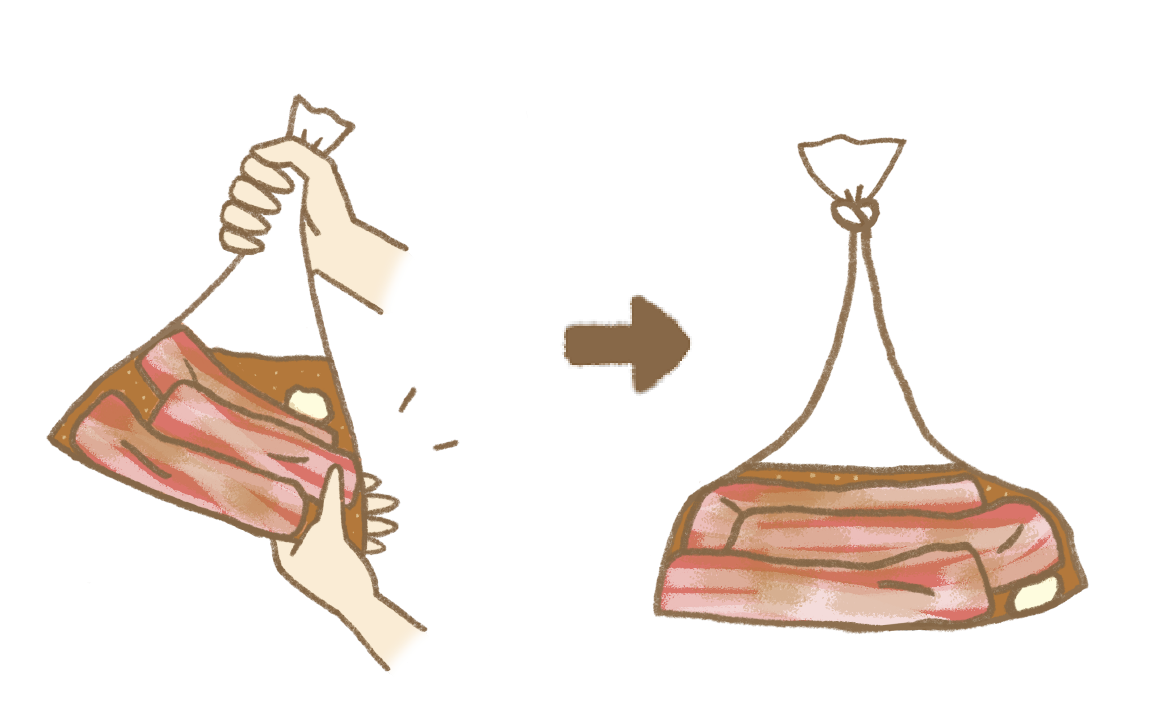 おいしい袋モフにパセリ以外の材料を入れてよく混ぜ、袋の空気を抜いて口を上の方で閉じる。