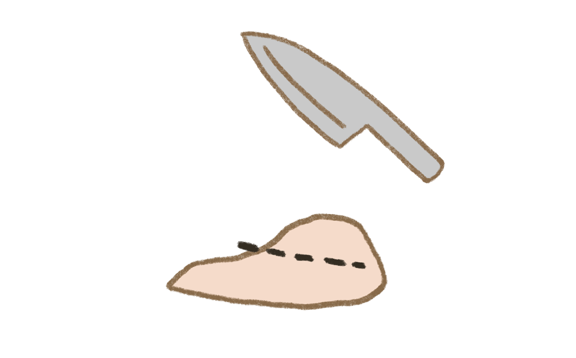 鶏むね肉は、余分な水分や血合いを拭き取り、厚みのある部分を切り開いて肉の厚さを均一にする。