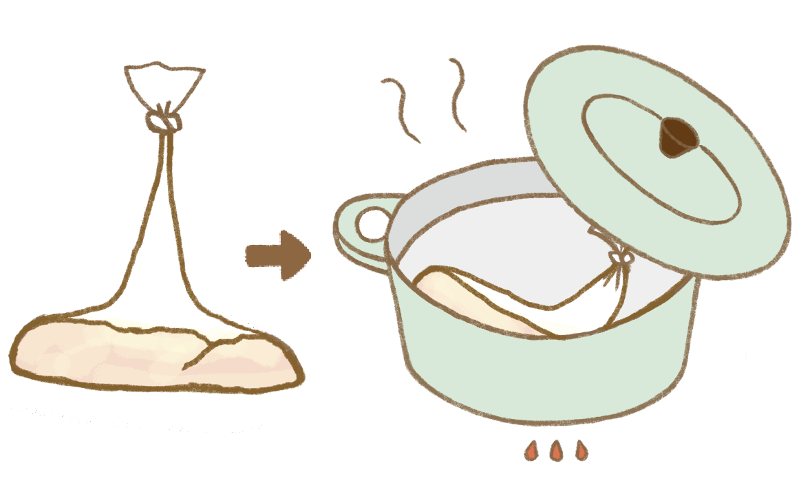 鶏むね肉をおいしい袋モフに入れ、塩こうじ大さじ2を加え混ぜ、袋の空気を抜いて結び、鍋に入れる。